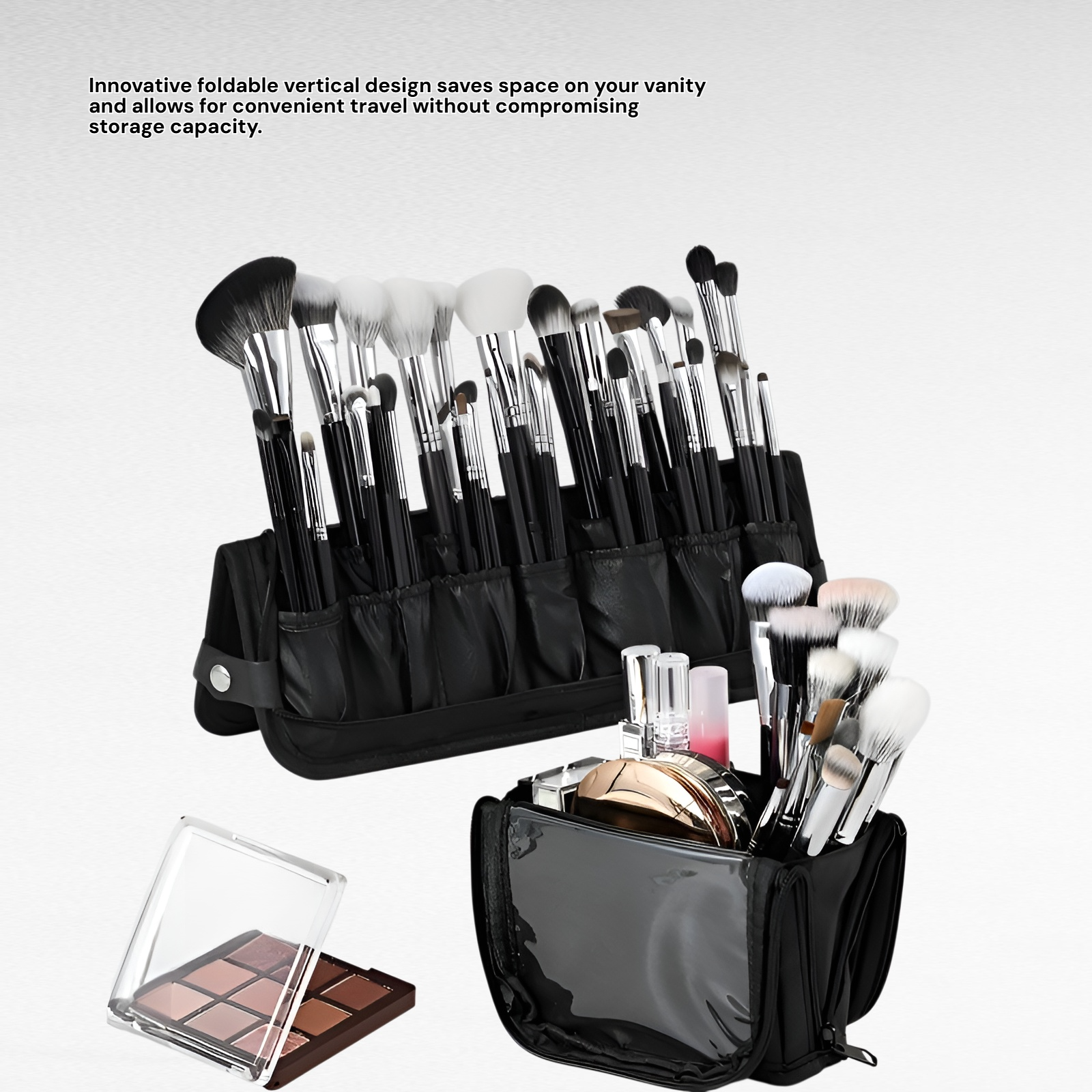 ● Features a unique vertical foldable structure, allowing you to save space in your luggage or vanity while keeping brushes upright and protected from dust and damage.
