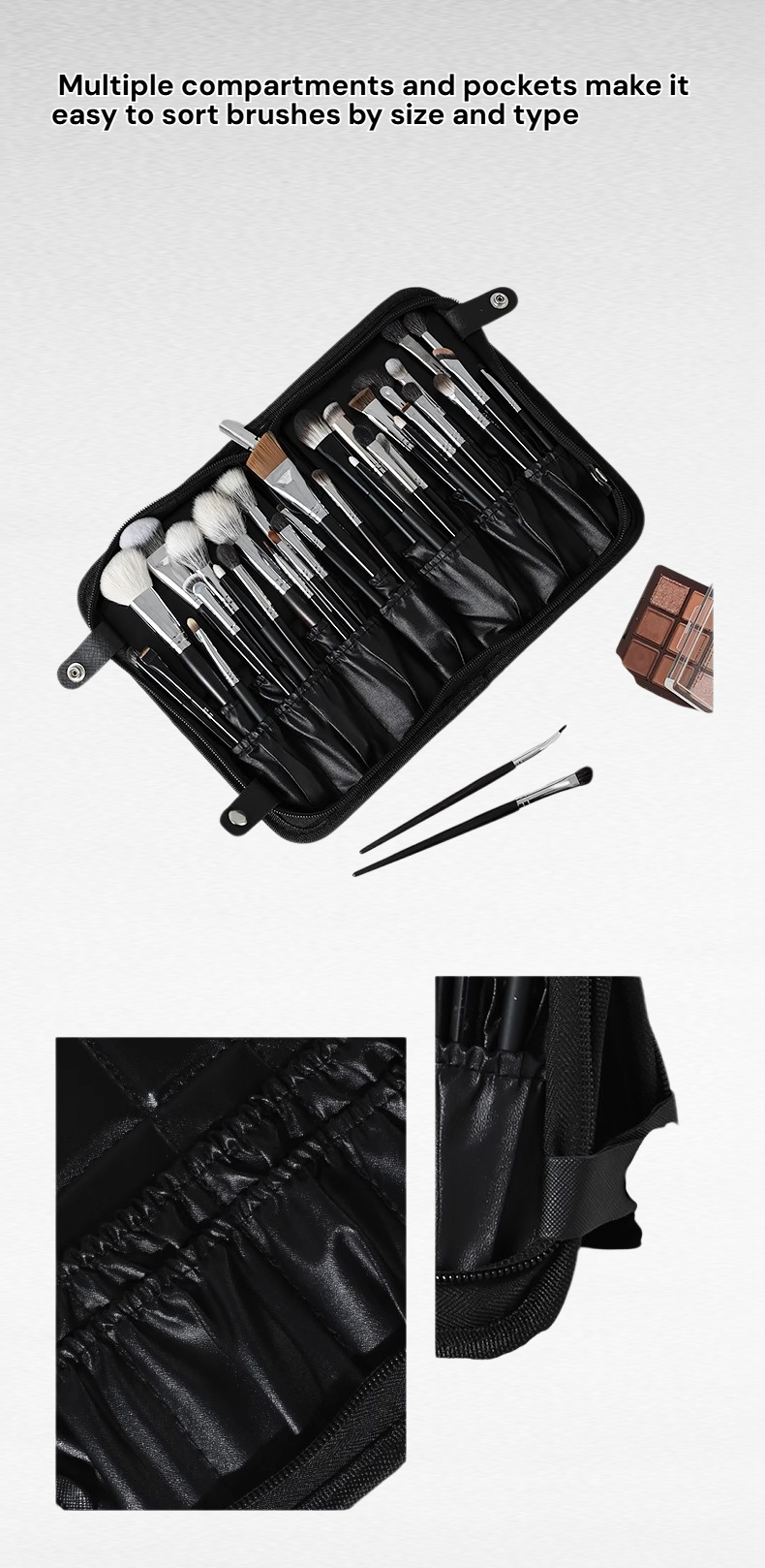 ● Designed with a spacious interior and multiple compartments, this makeup brush bag easily organizes all your brushes and beauty tools for quick access and tidy storage.